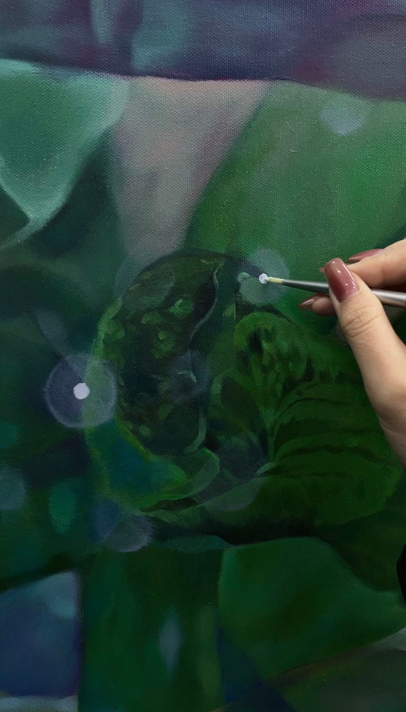 Departing from previous oil paintings, this time I used acrylics for the base layer because I wanted to experiment with how water-based materials could better reflect the transparent texture. I sketched out the drawing and decided on the colors I wanted to use, starting with pink, then green and yellow. After the acrylics dried, I applied oil paints. This painting was a challenge for me, as I was used to focusing on details in my previous works, but this piece required me to break from the conventional composition and choice of colors. The entire process required more imagination and less reference, so I let my lines flow more freely in multiple directions and blend background colors to extend more possibilities.